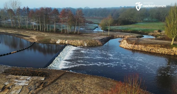 Het water van het kanaal wordt nu via een duiker onder de vistrap geleid. Meer uitleg op het informatiepaneel van Waterschap Regge en Dinkel.